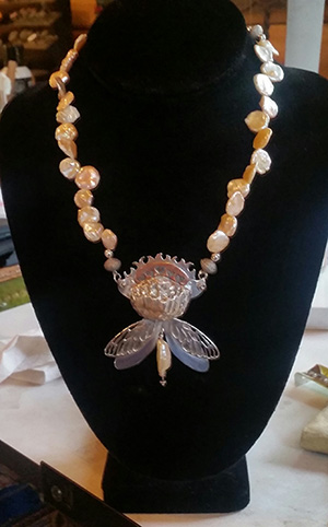 This necklace was commissioned by someone who loves wasps and bees, to commemorate the birth of her first grandchild. She asked me to make a piece that reflects her feelings, which inspired this design that has a silver wasp nest, wings, sun rays and copper hearts. It was a fun, challenging, meaningful and very satisfying project. As a result, I have decided to create a new jewelry line called, “Inspire Me!”