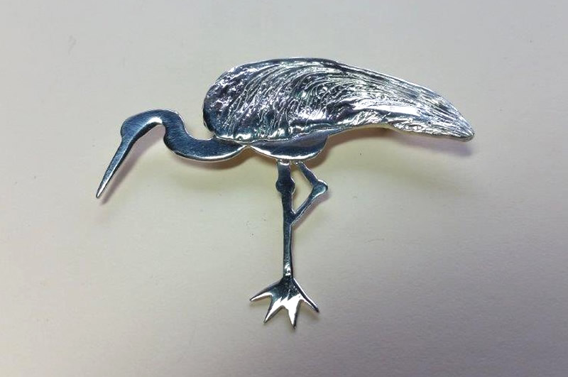 Description: This crane is sterling silver. The body is smooth and the feathers have a grooved texture (made from an impression of a maple seed; perhaps you can see it lying on its side on the back of the crane).