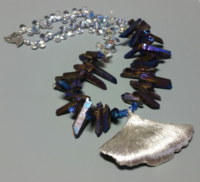 Description: A large silver gingko leaf on a crystal necklace which consists of crystal points that have been electroplated with titanium, and also glass crystal beads. The color contrasts are striking and the entire piece makes a stunning statement hanging high on the throat.