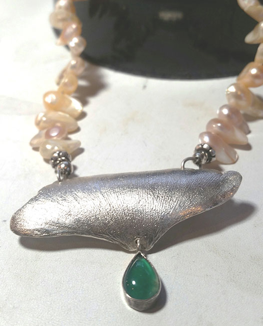 Description: This is a Midwestern version of a whale tail. It is a pure silver casting of a gingko leaf. The stone is green chalcedony, which is a type of quartz. The necklace is made of freshwater pearls and sterling silver beads. The hook and eye are sterling and handmade.